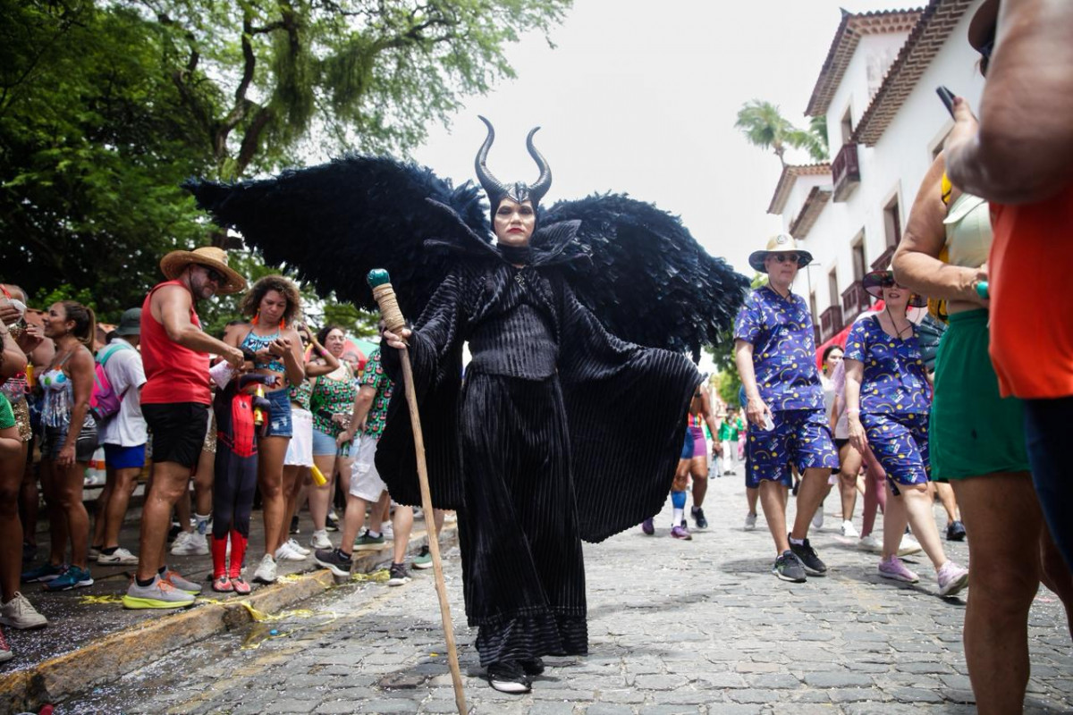 Outra fantasia que chamou olhares foi a da moradora de Paulista Angelina Jolie Araújo, que interpreta a vilã Malévola com um figurino detalhado, composto por veludo, penas e estrutura metálica que forma asas móveis.