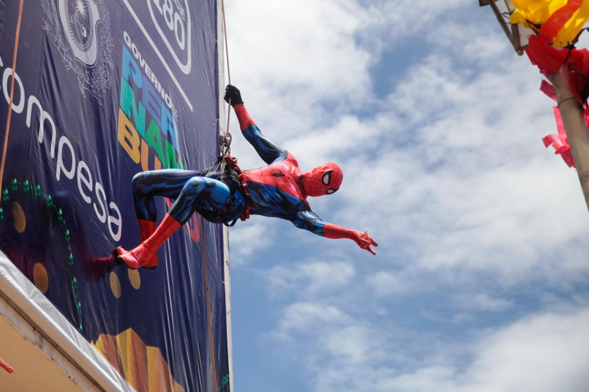 Entre os momentos mais aguardados do desfile está a tradicional apresentação do Homem-Aranha, que realiza performances na caixa d’água de Olinda, com cerca de 19 metros de altura, cena que já se tornou uma das atrações do bloco.