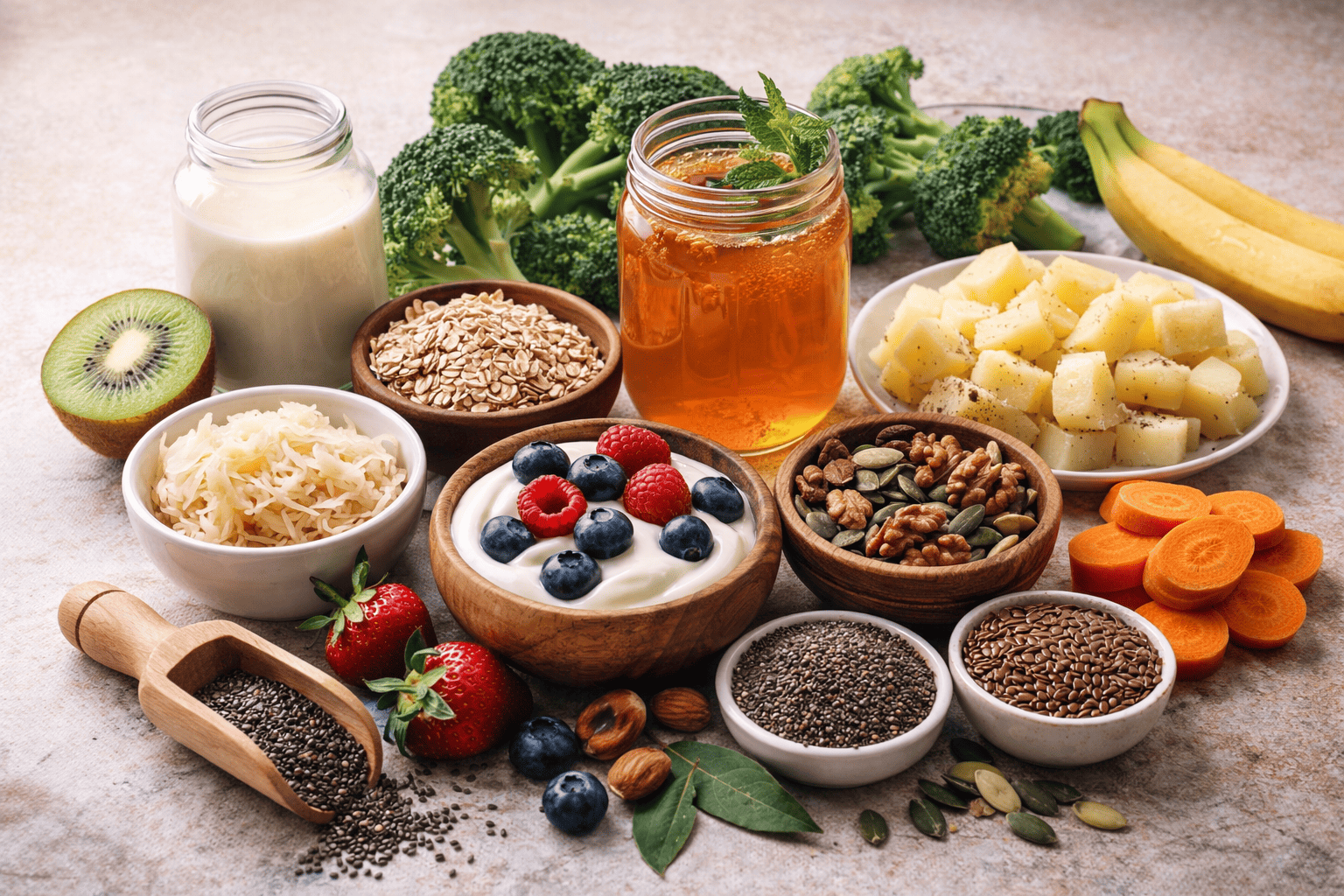 Entre os principais aliados estão os alimentos fermentados, como iogurte, kefir e kombucha. Eles são ricos em probióticos — microrganismos vivos que ajudam a equilibrar a flora intestinal e melhorar a digestão. O consumo frequente desses itens pode contribuir para a imunidade e até reduzir inflamações no organismo.