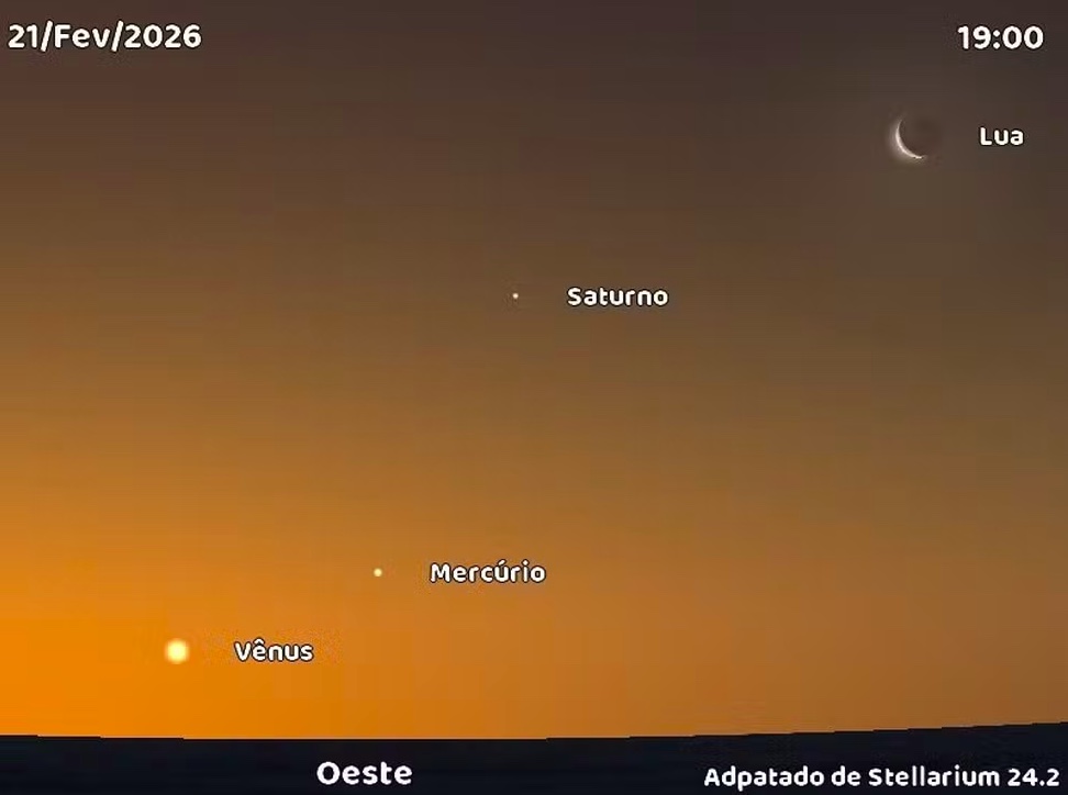 Vênus e Mercúrio aparecem mais próximos da linha do horizonte, o que pode dificultar a observação. Saturno surge um pouco acima e permanece visível até cerca das 20h. Júpiter também se destaca com brilho intenso.