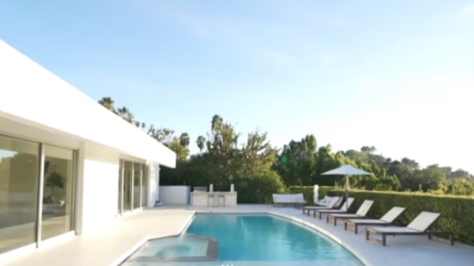 A residência dispõe de cinco suítes, cinco banheiros e amplos ambientes integrados. Cozinha equipada, áreas de convivência espaçosas e setores externos voltados ao lazer compõem o conjunto. O padrão segue o perfil de mansões localizadas em regiões valorizadas de Los Angeles, com ênfase em conforto e discrição.