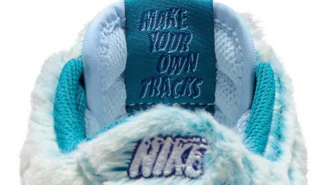 Com uma paleta de cores que mistura Azul Celestine, Branco e Verde Abyss, o tênis combina sobreposições peludas com uma base mais curta e igualmente macia. O logo da Nike na língua e no calcanhar ganha um efeito “congelado”, enquanto o interior da língua traz a mensagem “faça suas próprias trilhas”.