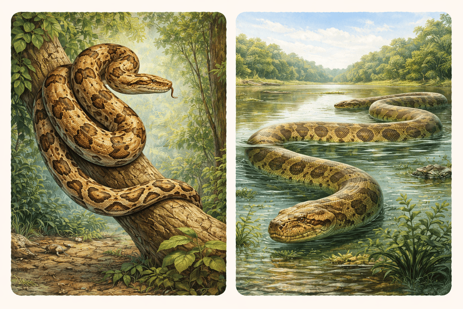 A jiboia e a sucuri são duas serpentes bastante conhecidas no Brasil, mas apresentam diferenças importantes em tamanho, habitat e comportamento. A jiboia é uma cobra de porte médio a grande, podendo chegar a cerca de 3 a 4 metros de comprimento. Já a sucuri é considerada uma das maiores cobras do mundo, podendo ultrapassar os 7 metros e pesar mais de 100 quilos.