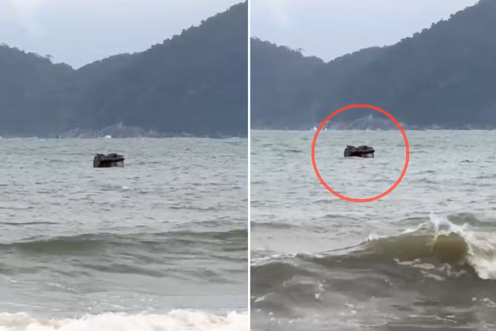 A ressaca no mar de Santos, no litoral de São Paulo, provocou a curiosidade de moradores na Ponta da Praia no início desta semana. Tudo porque um objeto não identificado foi visto no mar e intrigou os observadores. As imagens registradas mostram uma estrutura quadrada visível acima da superfície da água.