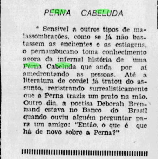 Um morador de São Lourenço da Mata, sabe-se lá como, invadiu a sede do jornal para relatar como e quando fora brutalmente atacado por uma fantasmagórica perna cabeluda.