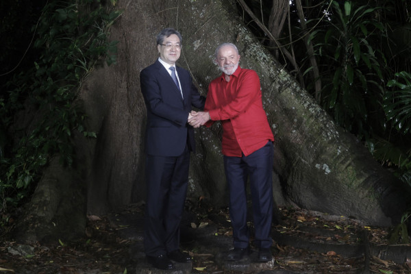 O presidente do Brasil, Luiz Inácio Lula da Silva (à direita), e o vice-primeiro-ministro da China, Ding Xuexiang, se cumprimentam durante uma reunião em Belém, no estado do Pará, em 5 de novembro de 2025. ( Tarso Sarraf / AFP)