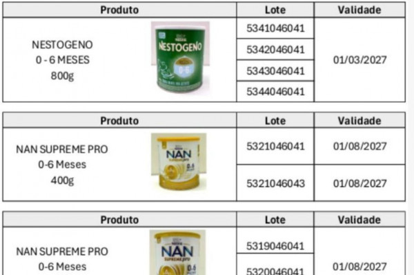 Uma medida da Anvisa (Resolução 32/2026), publicada nesta quarta-feira (7), determinou a proibição da comercialização, da distribuição e do uso de alguns lotes de fórmulas infantis das marcas Nestogeno, Nan Supreme Pro, Nanlac Supreme Pro, Nanlac Comfor, Nan Sensitive e Alfamino, da empresa Nestlé Brasil Ltda., CNPJ: 60.409.075/0001-52.