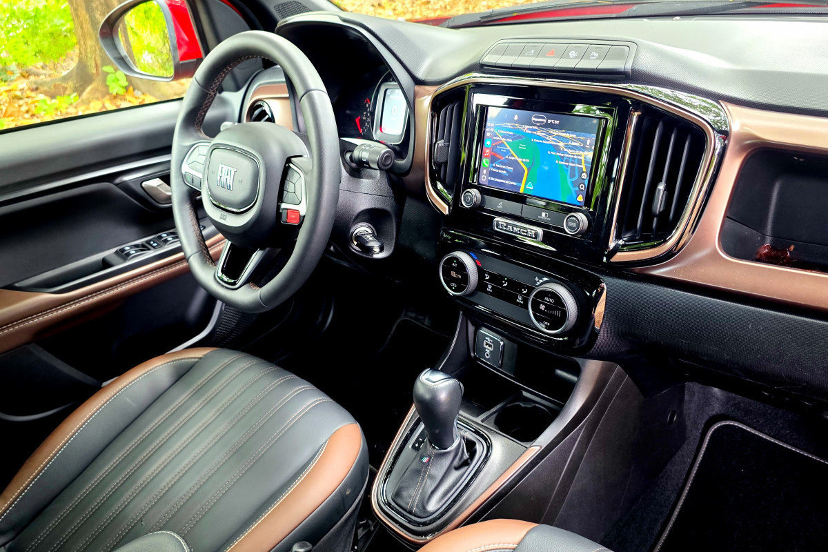 Por dentro, a picape acomoda razoavelmente bem para cinco ocupantes, e oferece uma lista interessante de itens de comodidade, começando pelo ar-condicionado digital automático, bancos com forração de vinil e costura marrom exclusiva da versão Ranch.
