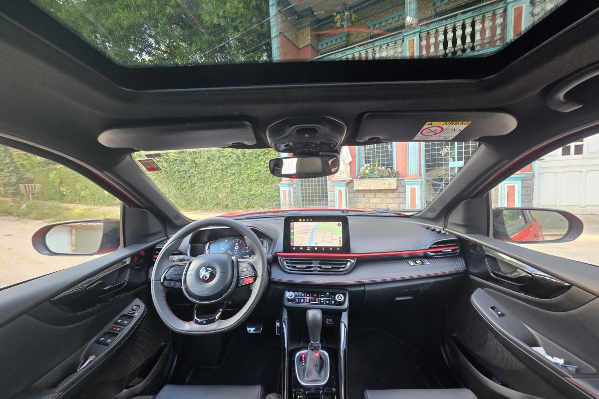 Por dentro, o ambiente escurecido predomina. O painel revestido em material suave ao toque recebe costuras vermelhas, replicadas nos bancos esportivos e no volante. A tecnologia é garantida pela central multimídia de 10,1 polegadas com conexão sem fio para Android Auto e Apple CarPlay, além do painel de instrumentos 100% digital de 7 polegadas, que conta com grafismos exclusivos da versão esportiva, exibindo pressão do turbo e força G (indicador da aceleração em relação à gravidade..