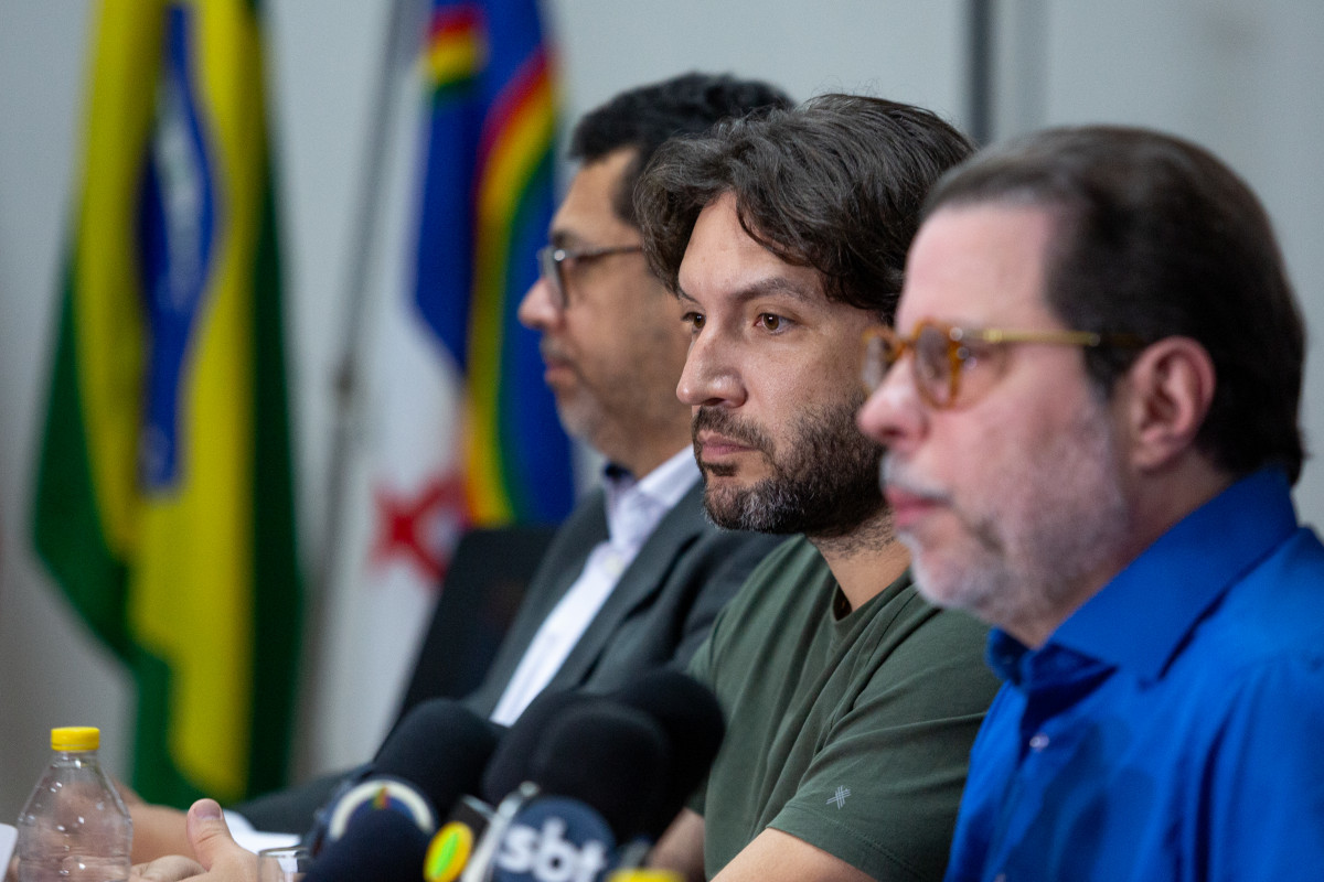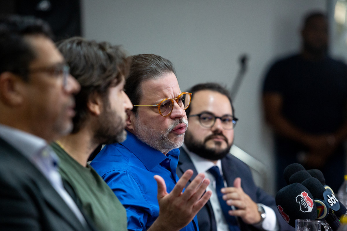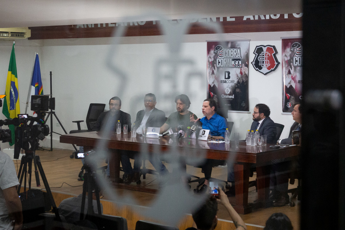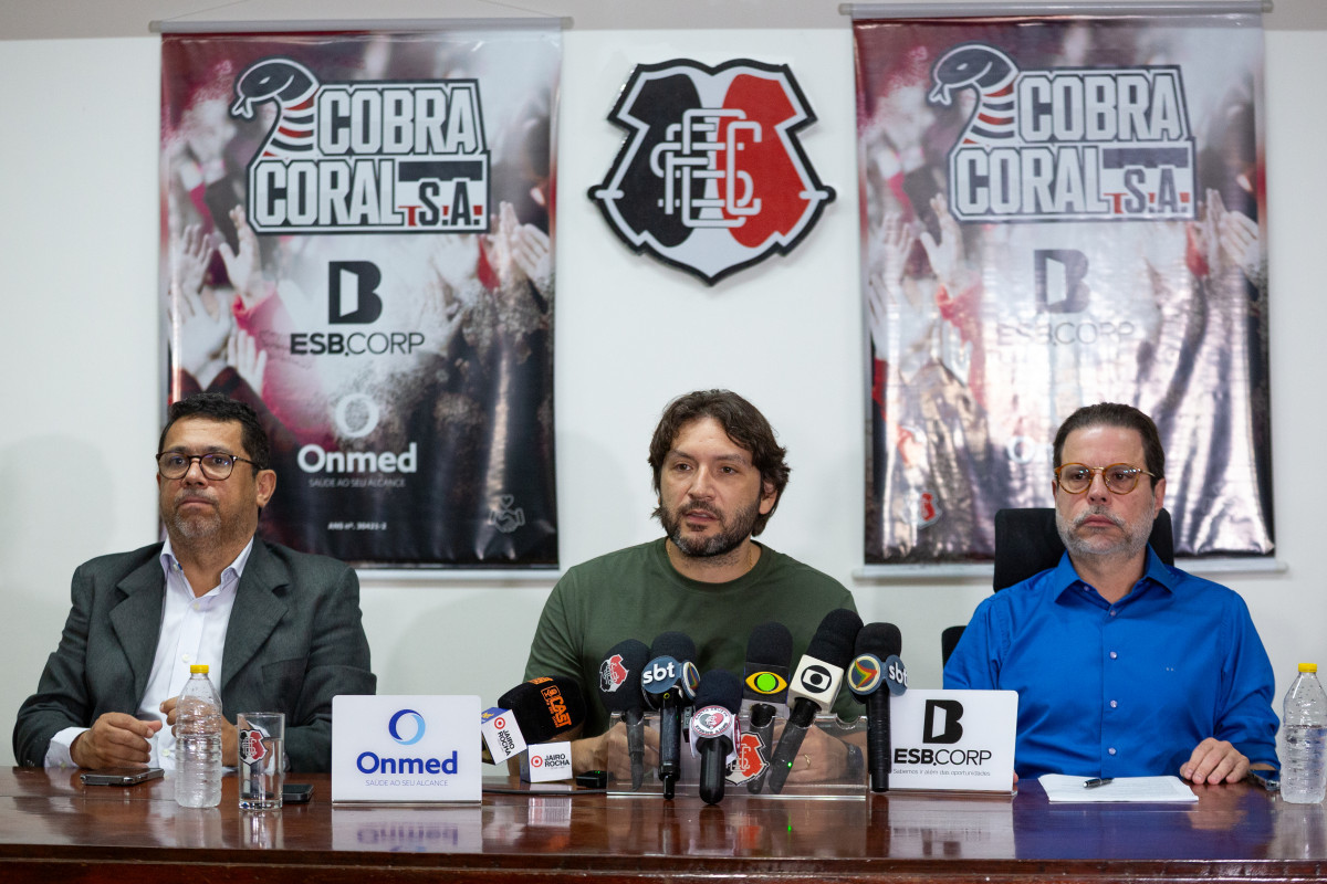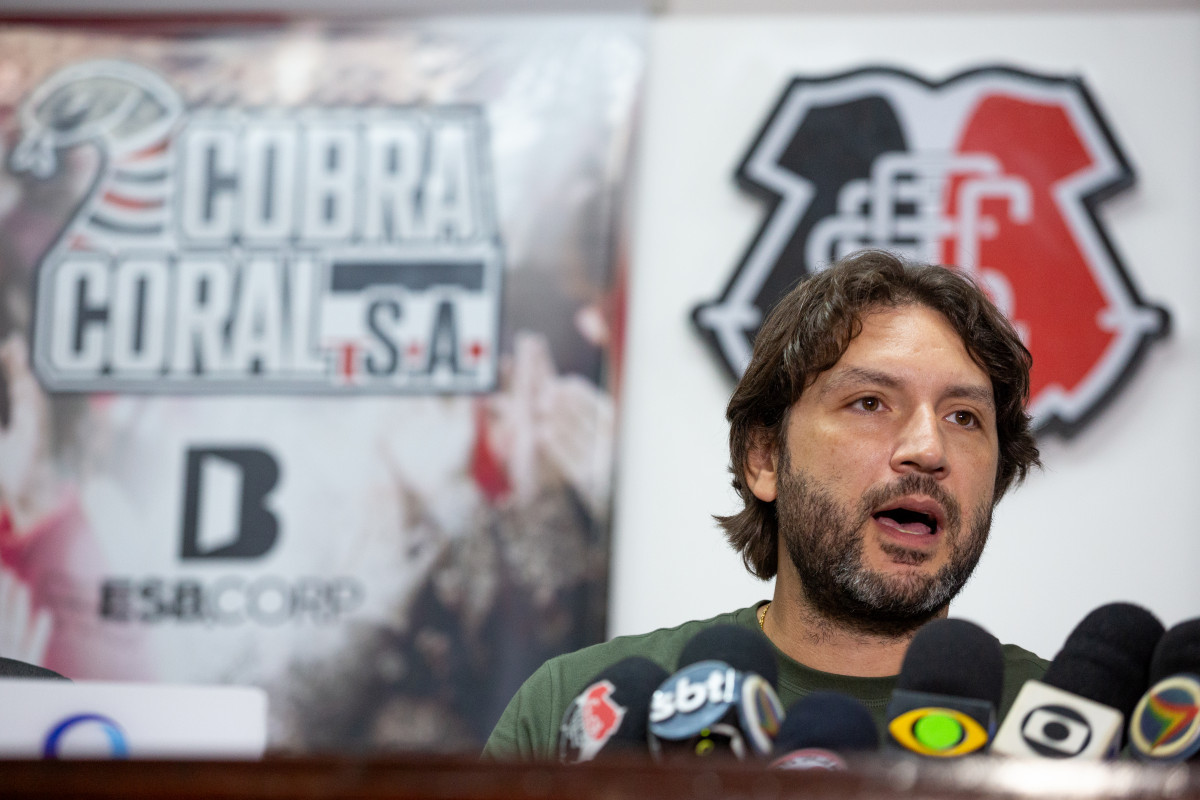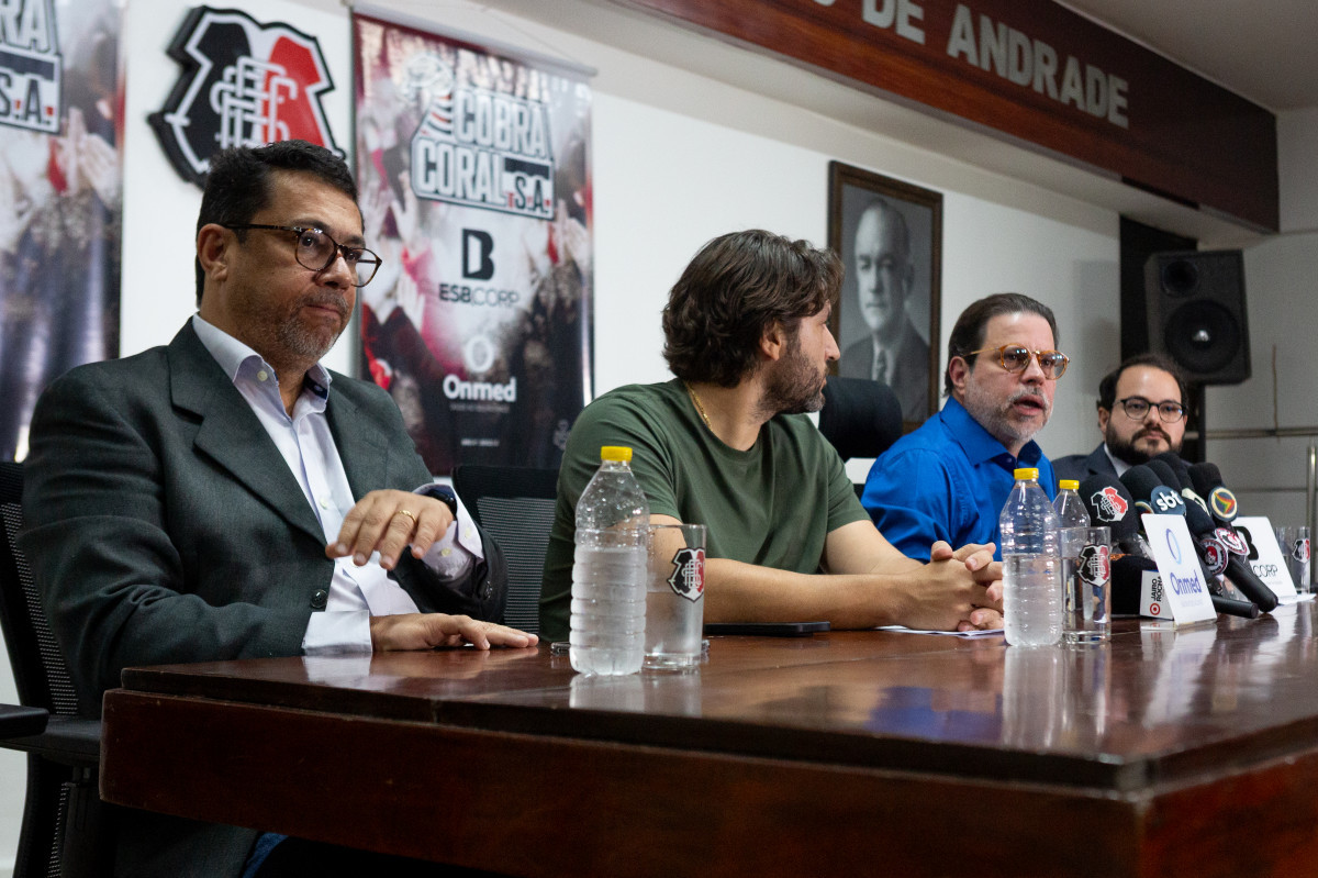 Recife, PE, 10/09/2025 - COLETIVA SAF SANTA CRUZ - O Santa Cruz anunciou, na manhã desta quarta-feira, uma estimativa de prazo para finalizar o processo de constituição da SAF. Depois da assinatura do último aditivo da proposta vinculante, feita há uma semana, o acordo será apreciado pelo Conselho Deliberativo, depois seguindo para a Assembleia Geral de Sócios. Bruno Rodrigues, Iran Barbosa. (Rafael Vieira)