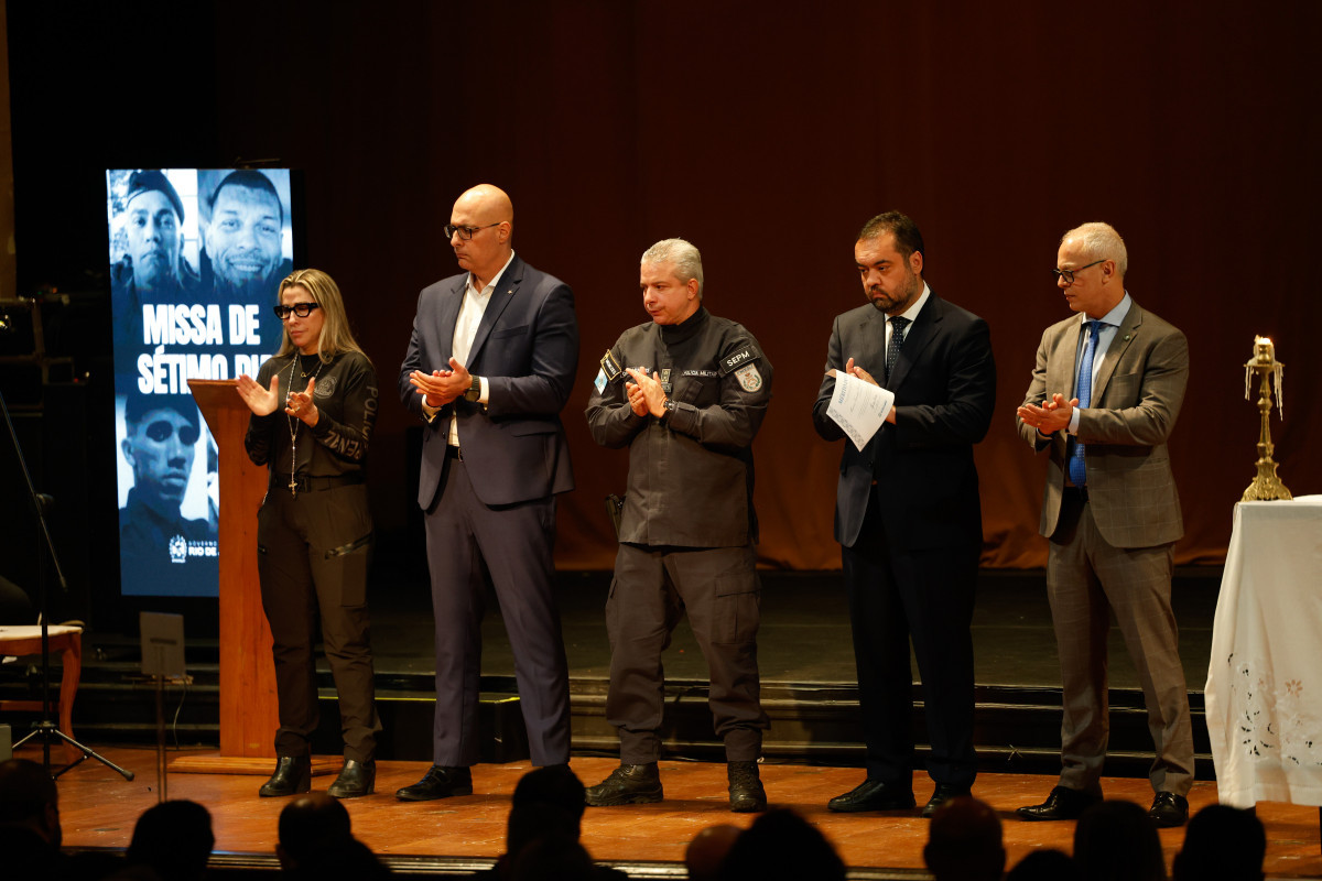 Foi celebrada nesta quinta-feira (6), no anfiteatro do Theatro Municipal do Rio, a missa de sétimo dia dos quatro policiais mortos na Operação Contenção, no dia 28 de outubro, nos complexos da Penha e do Alemão.