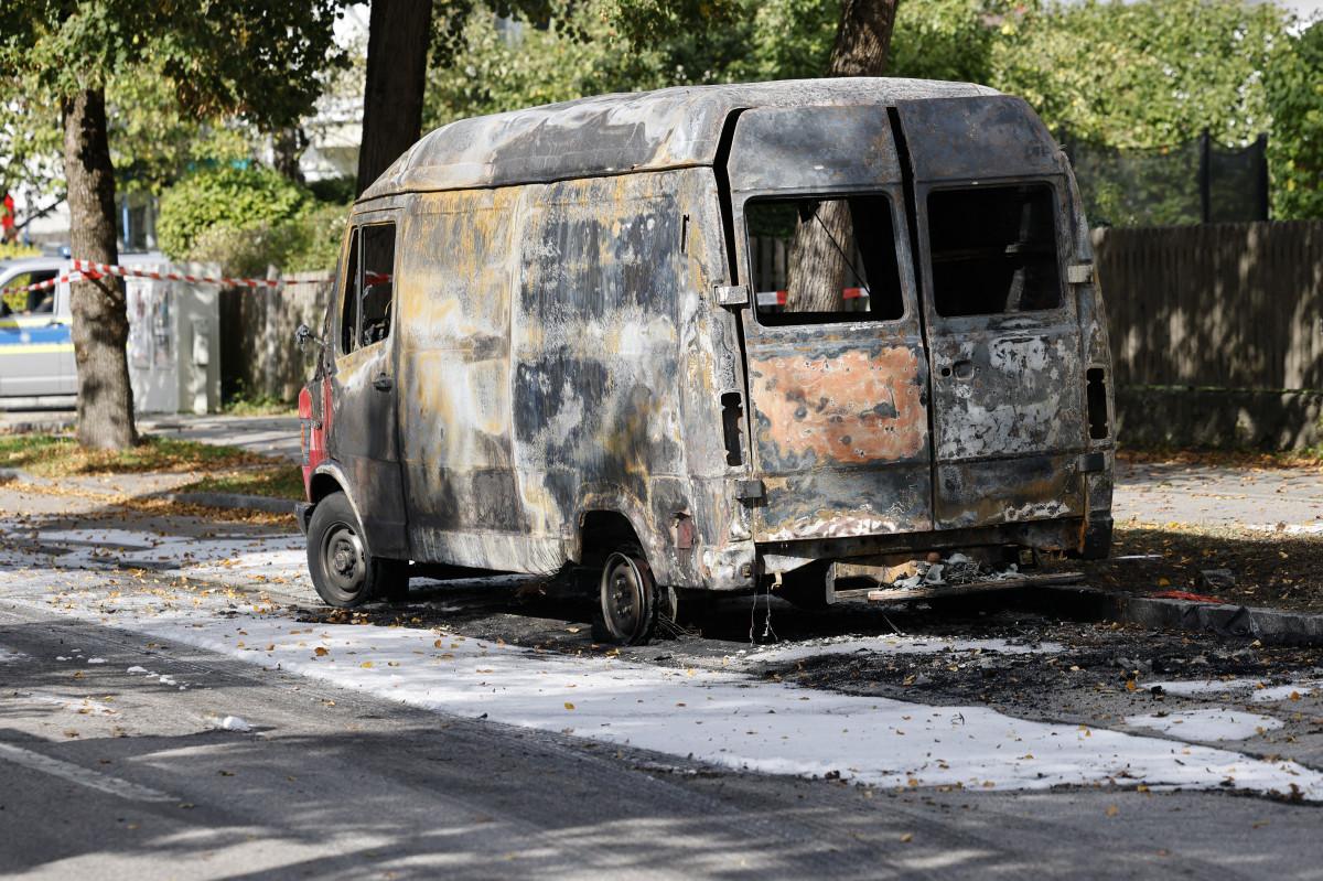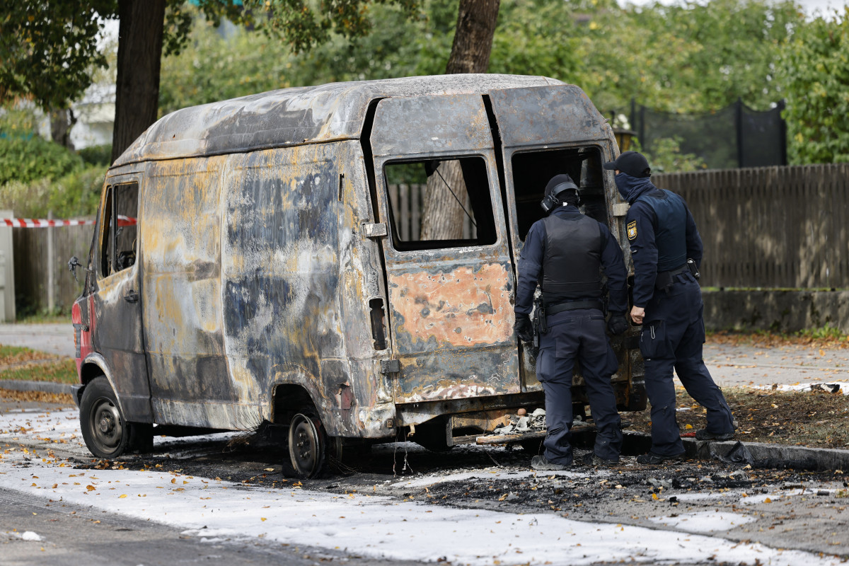 Policiais inspecionam uma van incendiada estacionada na rua perto do local onde explosões foram ouvidas (ALEXANDRA BEIER / AFP)