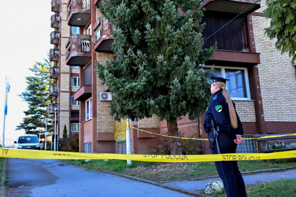 Um policial bósnio faz a guarda enquanto outros policiais isolam a área durante uma investigação sobre o incêndio mortal ocorrido no dia anterior em um lar de idosos na cidade de Tuzla, no nordeste da Bósnia, em 5 de novembro de 2025. Um incêndio em um lar de idosos no nordeste da Bósnia matou 11 pessoas e feriu pelo menos 30, informou a polícia em 5 de novembro de 2025, enquanto os investigadores continuam a apurar a causa do incêndio. (Foto de ELVIS BARUKCIC / AFP) ( AFP)