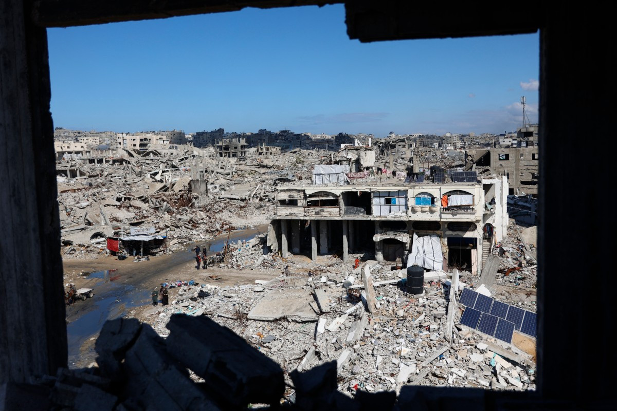 Palestinos caminham em meio aos escombros de prédios destruídos no bairro de Sheikh Radwan, na Cidade de Gaza, em 4 de fevereiro de 2026. Apesar de uma trégua mediada pelos EUA ter entrado em sua segunda fase no início de janeiro, a violência no território palestino continuou, com Israel e o Hamas acusando-se mutuamente de violar o acordo. (Foto de Omar AL-QATTAA / AFP)/ AFP