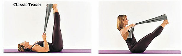 Execução do movimento: inspire e, durante a expiração, contraia o abdômen, ativando o músculo transverso do abdômen, flexione o tronco até sentar sobre os ossos ísquios, abduzindo os ombros e levando os cotovelos para longe do tronco. Puxe a faixa, alongando os músculos dos membros inferiores. Inspire e volte à posição inicial.