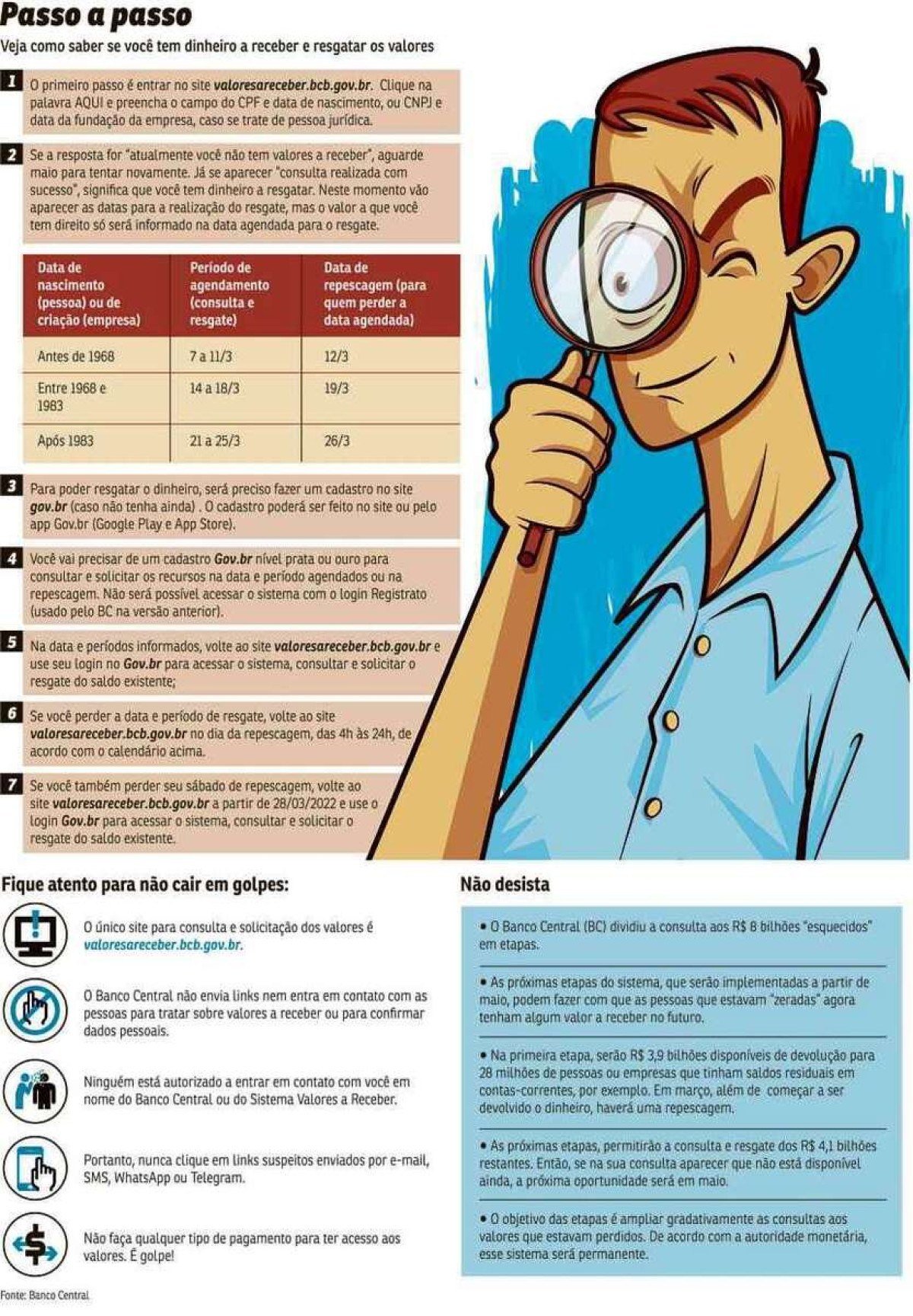 Em março, além do início das devoluções, haverá uma repescagem. As próximas etapas, a partir de maio, permitirão a consulta e resgate de outros R$ 4,1 bilhões. De acordo com a autoridade monetária o sistema de SVR será permanente.