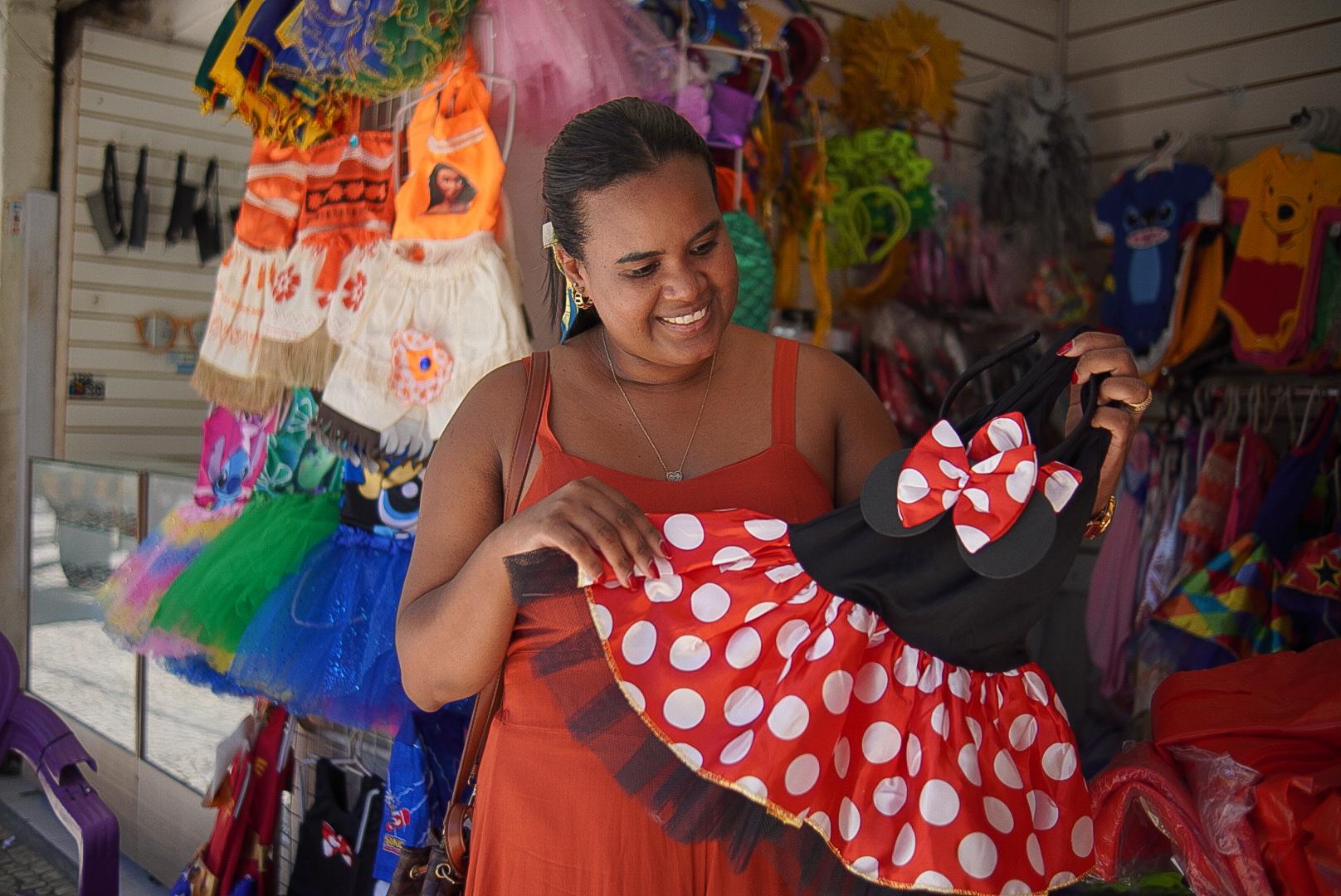 Já a arquiteta Shirleide Villela, de 38 anos, escolheu a fantasia da Minnie para a filha de um ano, que pretende usar em uma festa de carnaval infantil. Ela conta que a ideia é também ir em busca de adereços que lembram a personagem para combinar com a filha. Em relação aos preços das peças, ela ressalta que comprar no centro acaba sendo a opção mais barata. “Os preços estão bastante acessíveis, inclusive eu já encontrei na internet um pouco mais caro do que aqui no centro da cidade e a fantasia a gente acaba usando apenas uma ou duas vezes”, afirma Shirleide, destacando que a ideia é gastar em média R$ 100.