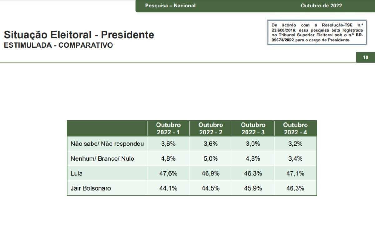 No comparativo com as pesquisas do mesmo Instituto, o ex-presidente manteve um padrão de estabilidade em relação as medidas anteriores, enquanto Bolsonaro oscilou positivamente para além da margem de erro aproximando-se do petista. O estudo também apontou que 3,4% dos entrevistados indicaram votar em nenhum dos candidatos, em branco ou nulo, e aponta que ainda 3,2 dos eleitores ainda estão indecisos quanto ao voto de amanhã.