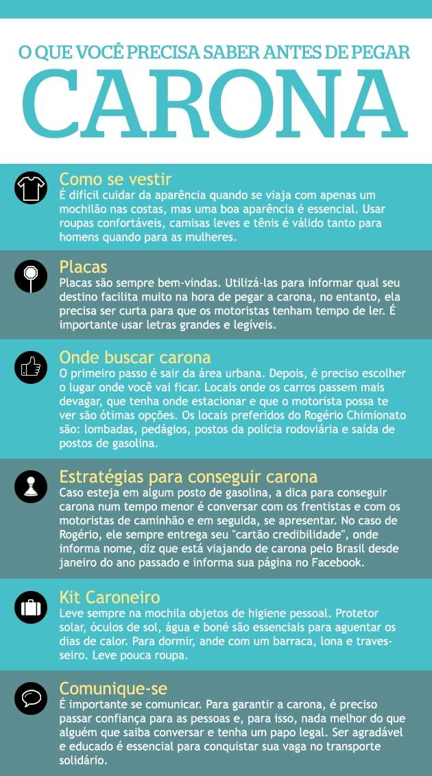 Se o assunto é carona, nada melhor do que falar com um expert no assunto. Em 2014, o mochileiro Rogério Chimionato pegou mais de 150 caronas no Brasil. Segundo ele, tudo era novidade no início, mas agora o foco é ser mais eficiente para poder diminuir o tempo de espera.