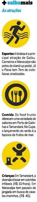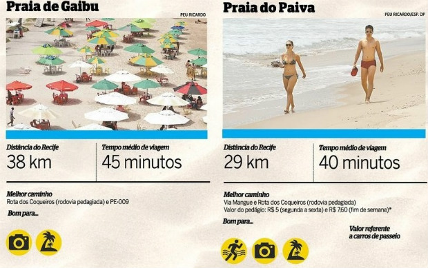 Praias tranquilas e balneários badalados formam o Litoral Sul de Pernambuco, que fica lotado de veranistas e turistas nesta época. Carneiros ou Porto de Galinhas? Gaibu ou Maracaípe? Para ajudar os pernambucanos e visitantes a organizarem seus roteiros, o Diario visitou dez praias e elencou os pontos fortes de cada uma. As informações foram organizadas em cinco categorias: esportes, comer, crianças, natureza e fotografar. Em janeiro, diferentes tribos se dividem para curtir o que cada praia tem de melhor. No Paiva, praia situada no Cabo de Santo Agostinho, esportistas e surfistas são maioria. A estrutura cicloviária do bairro planejado atrai adeptos da bike. “Minha praia é o Paiva porque só aqui tenho segurança e estrutura para pedalar”, afirmou o artesão Wellington Lima, 57 anos. Também é lá que surfistas que reúnem, apesar das placas indicando o risco de ataque. O município tem outras duas praias no roteiro - Calhetas e Gaibu.