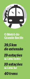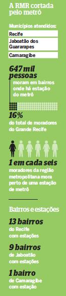 O metrô, nas palavras do professor do Departamento de Engenharia Civil da UFPE Fernando Jordão, parece um estranho no tecido urbano. Corta três municípios da metrópole, mas carrega em cada composição a imagem de que está sempre à margem. Das quatro milhões de pessoas que vivem no Grande Recife, cerca de 16% moram perto de uma estação. O atendimento direto não passa de um a cada seis moradores. A capital tem mais paradas, ainda que na proporção regional Jaboatão apresente maior percentual de bairros assistidos.