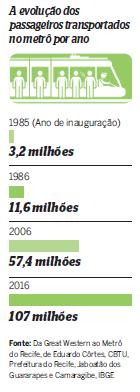 Após mais de três décadas em operação, o metrô passa a ser eixo de chances para repensar o desenvolvimento metropolitano, sobretudo com as discussões em torno do Estatuto das metrópoles. “A falta de planejamento tem custo perpetuado. O Recife não termina no limite das outras cidades. A metrópole tem um núcleo forte, mas todas as outras cidades são periferia. É preciso criar centralidades para melhorar a mobilidade”, conclui o ex-presidente da Fundação de Desenvolvimento da Região Metropolitana e conselheiro do Conselho de Arquitetura e Urbanismo Jório Cruz.