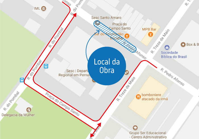 A partir das 22h desta terça-feira, uma obra de esgoto na Rua Pedro Afonso, no bairro de Santo Amaro, área central do Recife, vai interditar parte da via e mudar o trânsito no local. A previsão é que o reparo seja executado até a noite da próxima quinta-feira.