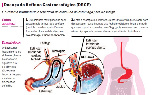 De acordo com Décio Chinzon, o refluxo é um fenômeno fisiológico que ocorre em todas as pessoas após as refeições. “É normal ter refluxos rápidos por curto período. Ele deixa de ser normal e se torna doença quando provoca sintomas e lesões”, explicou. No Brasil, os sintomas de DRGE mais recorrentes entre quem busca orientação médica são o próprio refluxo, a queimação no estômago e a azia. “O principal sintoma é a sensação de queimação que começa na boca do estômago e sobre até o peito, podendo chegar à garganta. Ou aquela sensação do alimento voltando. Há outros casos ainda de sintomas atípicos, que atingem 10% da população, como tosse, pigarro, dor torácica e até asma”, acrescentou Décio.