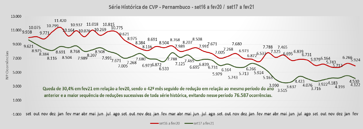 De acordo com a secretaria, a Zona da Mata foi a região que obteve a maior redução, com -47,31%, seguida de Sertão (-46,11%), Região Metropolitana (-33,02%) e do Agreste (-27,37%). A Capital pernambucana atingiu o menor índice desde o início da série histórica, em 2005, quando atingiu 2.174. Em fevereiro deste ano, contabilizaram-se 1.530 crimes, uma redução de 21,66% em relação a 2020, quando houve 1.953 queixas.