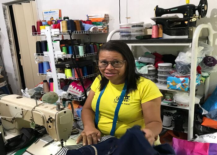 Antes de trabalhar profissionalmente como costureira, Janicleide foi agricultora, ajudando seu pai na roça, vendedora de verduras e vendedora de loja. Aos 24 a jovem costureira começou a costurar profissionalmente, trabalhando com confecção e consertos em diferentes locais, mas há 10 anos ela decidiu montar seu próprio negócio de costuras e consertos. “O último local em que trabalhei me fez perceber que eu poderia produzir para eu mesma. Hoje eu sou microempreendedora, trabalho para mim, consigo cuidar da casa e do meu filho. Tenho o meu dinheiro e divido sempre as contas da casa com meu marido”, conta.