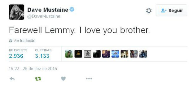 Líder do Megadeth, Dave Mustaine comentou a morte de Lemmy no Twitter. "Adeus, Lemmy. Eu te amo, irmão".
