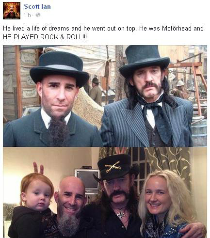 O guitarrista e fundador da banda de thrash metal Anthrax, Scott Ian, também prestou homenagem a Kilmister. "Ele viveu uma vida de sonhos e se foi enquanto estava no topo. Ele era o Motörhead e tocou o Rock & Roll!", postou no Facebook, como legenda de duas fotos com Lemmy.