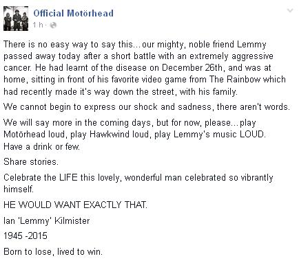 A página oficial da banda postou uma nota no Facebook. "Não há maneira fácil de dizer isso. Nosso nobre amigo Lemmy morreu hoje, após uma curta batalha contra um câncer extremamente agressivo. Ele descobriu a doença em 26 de dezembro, em casa, sentado e jogando seu videogame favorito [...]. Nasceu para perder, viveu para ganhar".