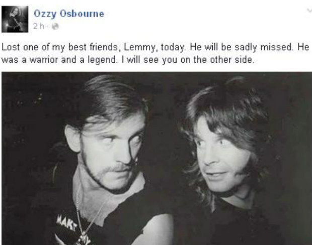 Outra lenda do Heavy Metal, Ozzy Osbourne lamentou a perda do amigo. Em sua conta no Facebook, o vocalista do Black Sabbath disse que Lemmy vai fazer falta. "Perdi um dos meus melhores amigos, Lemmy, hoje. Ele fará uma falta terrível. Foi um guerreiro e uma lenda. Vejo você no outro lado", disse.