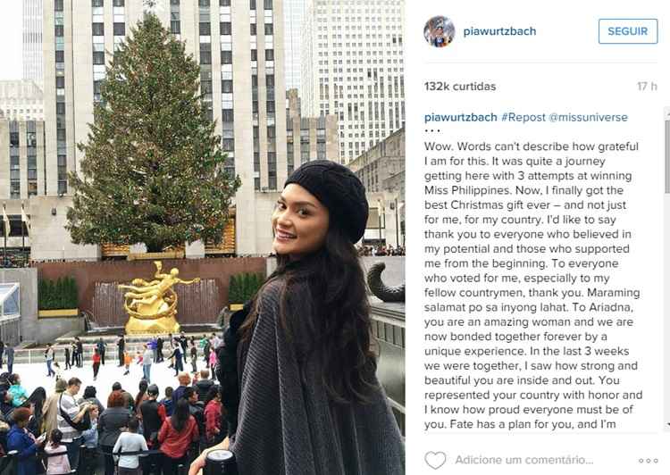 Pia ainda aproveitou para parabenizar Ariadna Gutierrez, a Miss Colômbia, por seu aniversário. "Você é uma mulher incrível e agora estamos conectadas para sempre por causa de uma experiência única. Você representou seu país com honra e eu sei o quanto todos devem estar orgulhosos. O destino tem um plano para você e eu estou animada para ver o que vem pela frente", completou a Miss Universo.