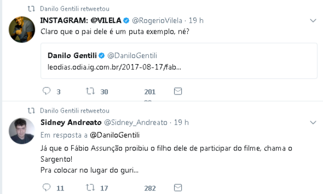 Conhecido por seus comentários irônicos, Gentili se limitou a dizer no Twitter "Essa foi dose..." e compartilhar posicionamentos críticos de outros internautas como "Claro que o pai dele é um puta exemplo, né?", publicada por um seguidor. O músico Roger Moreira (Ultraje a Rigor), que ganhou notoriedade nos últimos anos por comentários conservadores e alinhados à direita do espectro político, questionou: "Mais engraçado é um ator não saber explicar para ao filho a diferença entre fantasia e realidade."