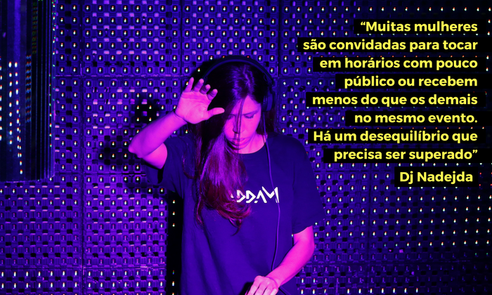 Foi da dificuldade em encontrar espaço para as mulheres nas cabines que a recifense Nadejda Maciel teve o ímpeto de criar um selo para mulheres, a MaddaM. “Realizamos eventos só com mulheres atuando em todas as áreas. Desde a designer que cria as artes, as DJs, a fotógrafa... Em todas as áreas do evento, tentamos empregar mulheres. O projeto nasceu do desejo por mudança e todas as envolvidas têm recebido mais convites para tocar, e também a resposta do público é bastante incentivadora”, explica. Nadejda acredita que as discussões que envolvem questões de gênero e inclusão têm feito com que os produtores repensem a formatação dos seus eventos. “Há uma certa expectativa e fantasia em torno da mulher DJ. O que acaba atingindo sua apresentação. Desde a vestimenta ao repertório. E, na ânsia de ser bem recebida pelo público, pode se perder a identidade artística e profissional. Infelizmente, muitas ainda atuam no amadorismo, o que faz com que as críticas ao trabalho das mulheres neste cenário sejam fortes e muitas vezes cruéis”, diz. Nadejda finaliza contando que a maior dificuldade que encontra em exercer a profissão é a aparência ofuscando o conhecimento técnico da profissional. “Ninguém pergunta se estamos discotecando porque nós amamos a música, ou onde encontramos aquela seleção musical fruto de uma pesquisa diferenciada. Mas muitos comentam sobre a roupa, o cabelo e a maquiagem. Me pergunto muito: Quando isso vai acabar?”, indaga.