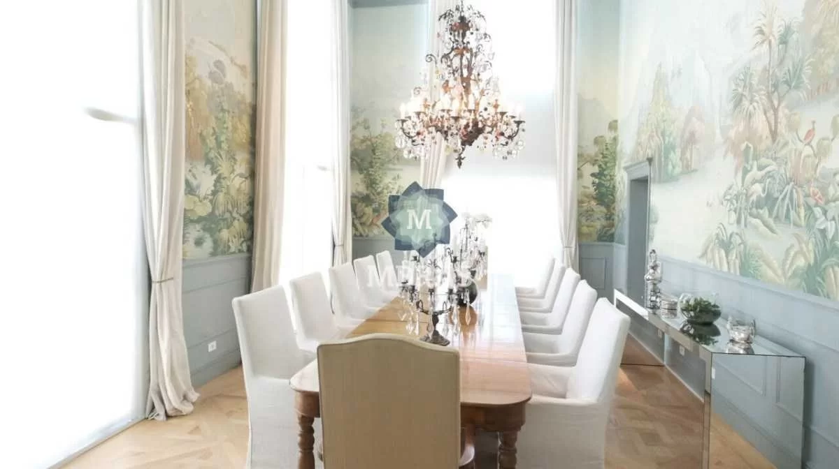 A sala de jantar é inteiramente pintada com Tromp LOeil (técnica que usa truques de perspectiva para criar ilusão ótica) em tons pastéis.