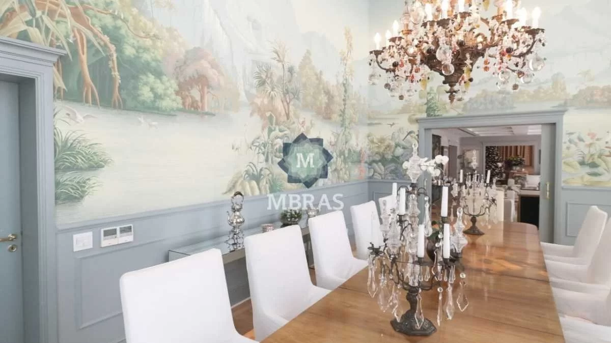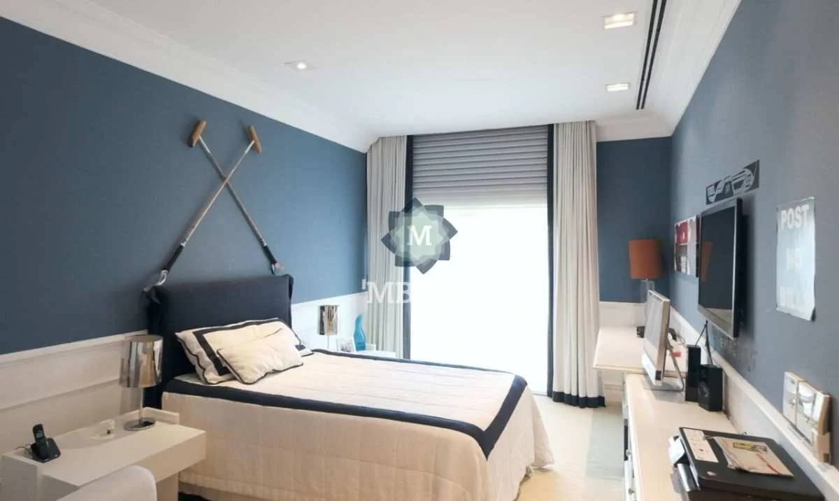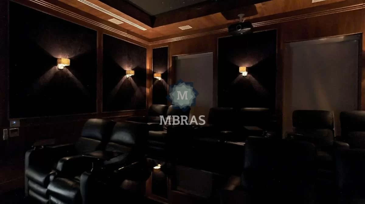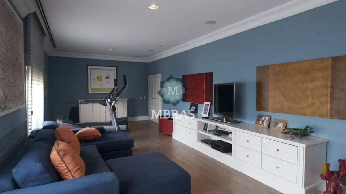 O imóvel tem ainda estúdio de música, salão de jogos, family room, sala de cinema com 16 lugares, home theater, lareira, adega, escritório, sala de almoço, cozinha espaçosa, dependência de empregados e área de cobertura com churrasqueira e lounge.