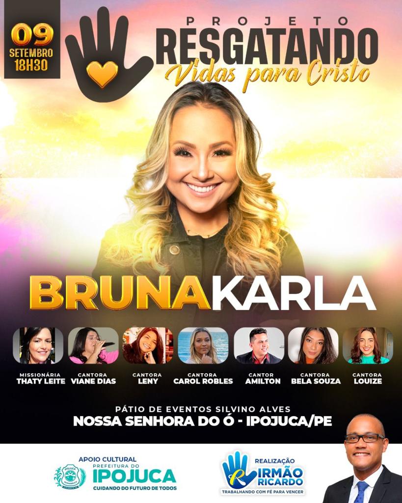A cantora Bruna Karla é uma das atrações confirmadas no show gospel gratuito que faz parte do projeto "Resgatando Vidas para Cristo", no Pátio de Eventos Silvino Alves, em Nossa Senhora do Ó, Ipojuca. O evento, que reunirá nomes da música evangélica, acontecerá na sexta-feira (9), às 18h30.