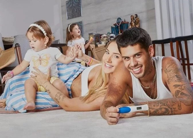 “Agora somos 5! Ainda estamos em êxtase com essa notícia, nos pegou de surpresa e estamos muito muito felizes! Obrigada Deus pela dádiva de sermos pais pela terceira vez, 2024 começou com tudo! Só peço a Deus que nosso neném venha com muita saúde, porque amor vai ter de sobra”, escreveu na legenda.