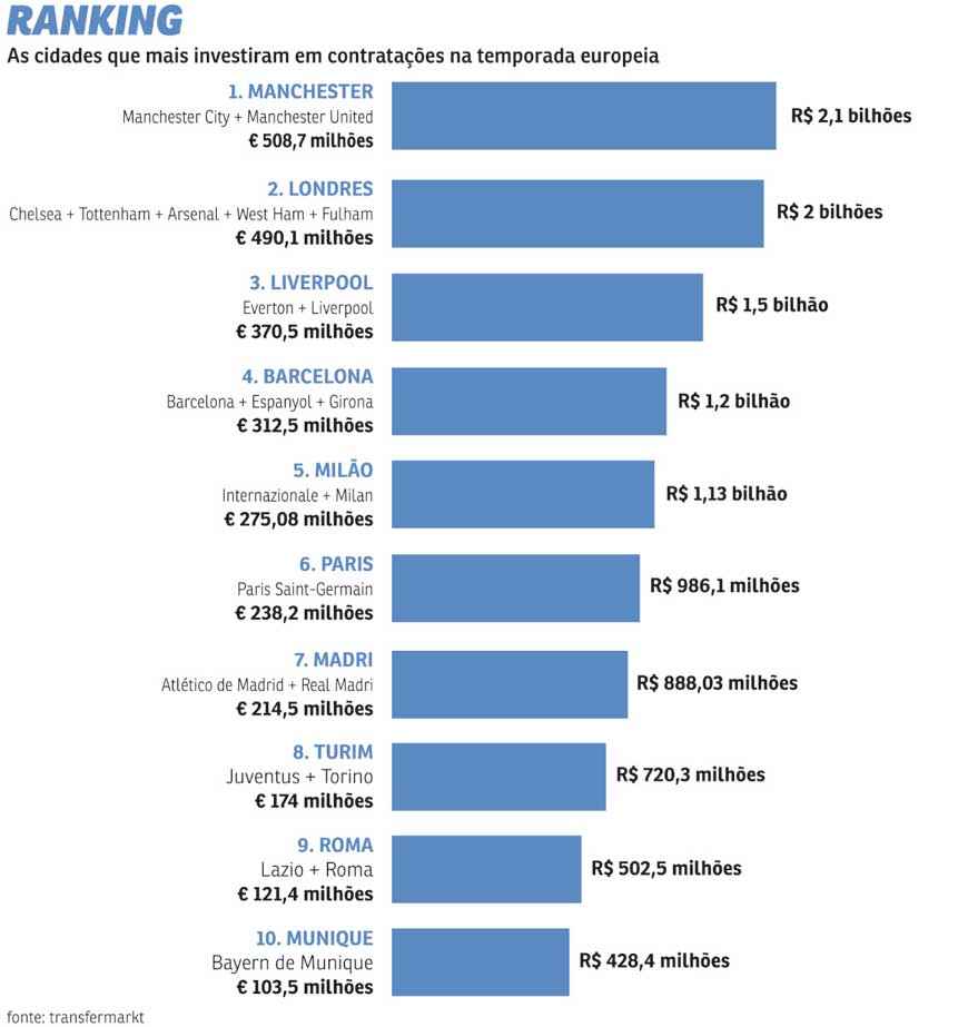 Nesta temporada, o City esbanjou bem mais do que o arquirrival United: 314,3 milhões de euros (R$ 1,3 bilhão). Pep Guardiola reforçou o elenco com o francês Mendy, o inglês Walker, o português Bernardo Silva, os brasileiros Ederson e Danilo e o espanhol Laporte. Até se deu ao luxo de tirar o promissor Douglas Luiz do Vasco e emprestá-lo ao Girona — um dos times satélites do Manchester City, administrado por Pere, irmão de Guardiola.