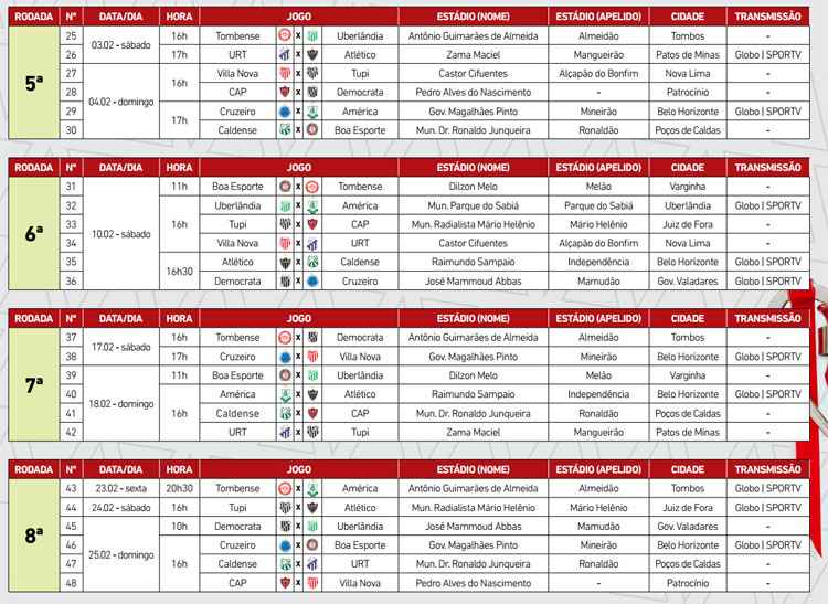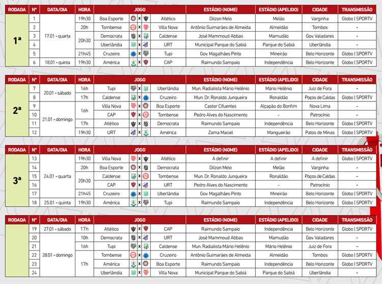 O clássico entre Atlético e Cruzeiro está marcado para o dia 4 de março, domingo, às 16, no Independência. O jogo será válido pela 9ª rodada do Estadual. Cruzeiro x América ocorrerá no dia 4 de fevereiro, na 5ª rodada. Já América x Atlético será em 18 de fevereiro, pela 7ª rodada.
