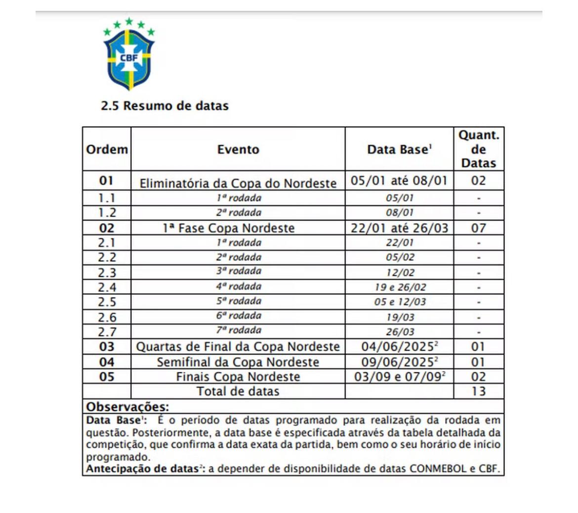 A CBF vai promover mudanças na Copa do Nordeste 2025. A principal modificação será na fase de grupos, que agora terá os confrontos entre times da mesma chave em vez do cruzamento entre os grupos A e B. Com isso, cada equipe vai disputar uma partida a menos, sete em vez de oito. [SAIBAMAIS]A fase de grupos terá o início no dia 22 de janeiro e vai até o dia 26 de março. A CBF vai divulgar em breve a tabela detalhada. O Nordestão segue com 16 times, entre eles Sport e Náutico, campeão e vice do Estadual 2024, respectivamente. As outras quatro equipes virão da fase eliminatória, na qual o Santa Cruz encara o Treze e o Retrô o Moto Club.