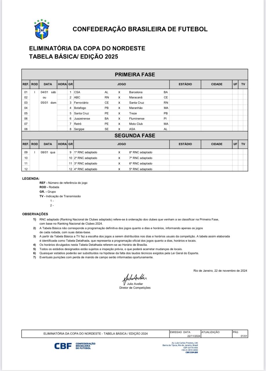 Nesta sexta-feira (22), a CBF divulgou o documento com as partidas da fase preliminar da maior competição regional do país, a Copa do Nordeste. 16 times disputam as quatro vagas da fase de grupos. Os confrontos de Santa Cruz e Retrô foram definidos, a Cobra Coral enfrenta o Treze-PB e a Fênix encara o Moto Club.