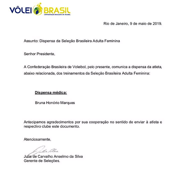 Veja o comunicado da CBV sobre a dispensa de Bruna Honório