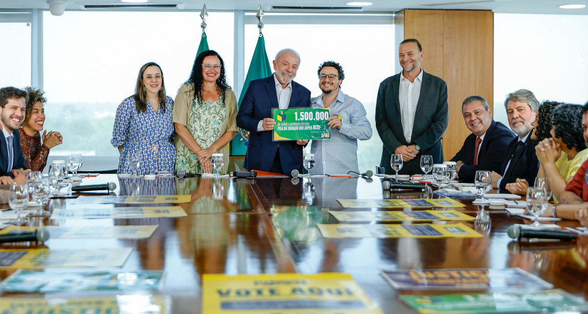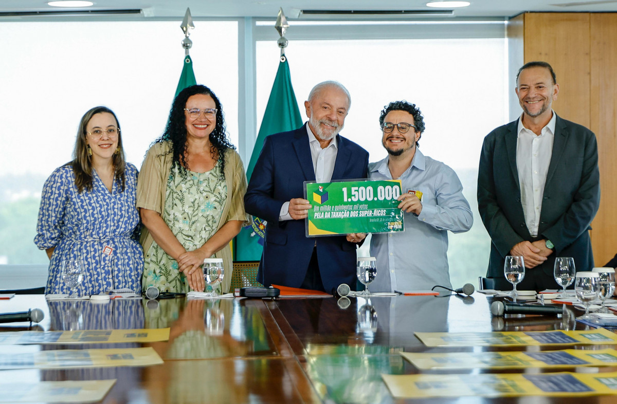 Movimentos e organizações populares se reuniram com o presidente Luiz Inácio Lula da Silva para entregar, de forma simbólica, mais de 1,5 milhão de votos favoráveis à isenção do Imposto de Renda (IR) para salários até R$ 5 mil, maior taxação de quem ganha acima de R$ 50 mil e pelo fim da escala de trabalho 6x1 e redução da jornada de trabalho sem redução salarial.