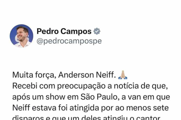 O ex-prefeito do Recife, João Campos (PSB), prestou solidariedade ao cantor de brega funk Anderson Neiff, que foi baleado no ombro após um ataque a tiros contra a van em que estava, na manhã deste domingo (26), em São Paulo. O atual prefeito do Recife, Victor Marques (PCdoB), e o deputado federal Pedro Campos (PSB) também se manifestaram.