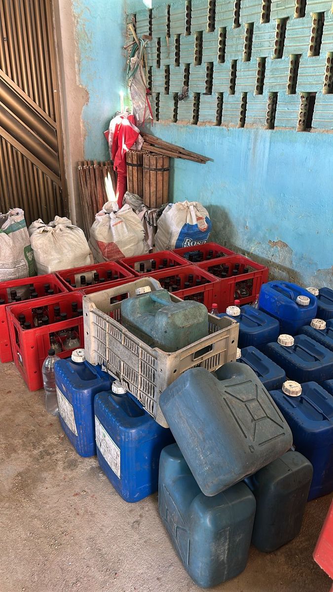 Durante a ação, desencadeada após denúncia sobre fabricação e venda de bebidas de origem duvidosa, os agentes encontraram 26 galões com líquido semelhante a álcool, seis sacos de vasilhames vazios, 30 grades de bebidas e caixas d’água utilizadas no processo de produção. Também foi apreendido um botijão com torneira adaptada para engarrafamento.