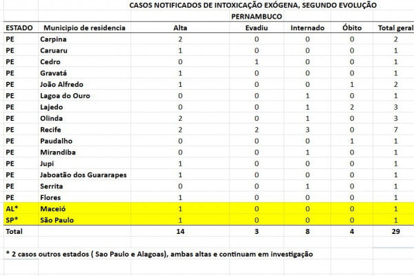 Com a nova notificação de caso, Pernambuco totaliza 29 casos suspeitos de intoxicação por metanol.